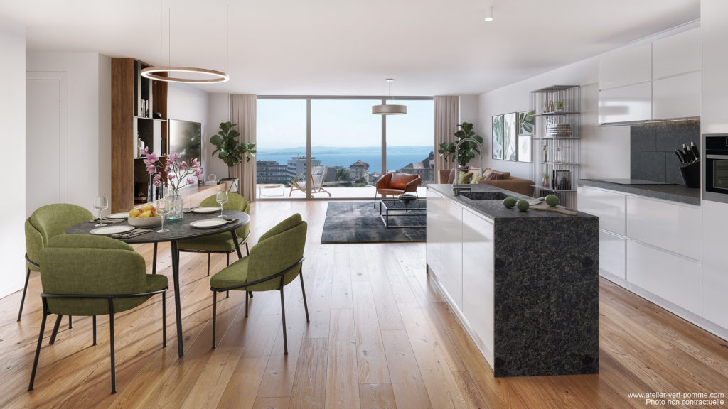 Budget fourniture: CHF 70.-/m2 TTC selon disponibilité et prix exposition à la commande faite par l’acquéreur.